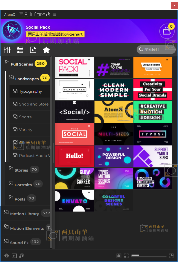 AE脚本-1125个现代时尚文字标题排版社交媒体包装调色转场背景音效图标动画预设 Social Pack(AtomX 3.0.8)