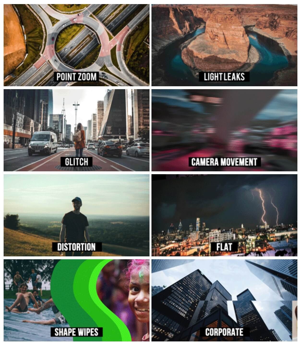 如焦点缩放、光斑、干扰、镜头推拉、变形、图形切割等效果