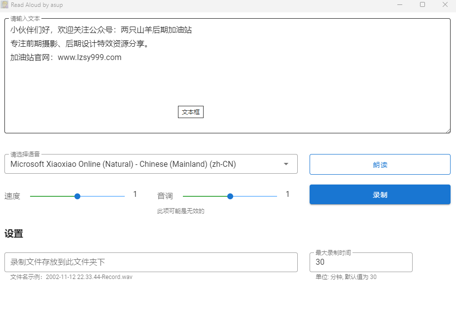 软件默认的语音文本是Xiaoxiao,你也可以自行选择其它人声,并且你可以自己设置语音的播放速度和音调水平。语音录制时间是没有限制的,你甚至可以录制24小时。