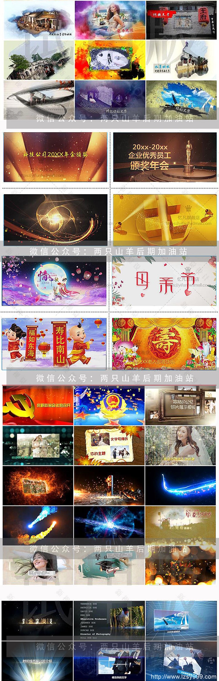包含各种片头片尾素材、婚礼、毕业、电子相册、快闪抖音、晚会年会、企业宣传、儿童卡通、各种节日类、Logo片头、党政新闻、颁奖典礼、新年拜年祝福类视频模板