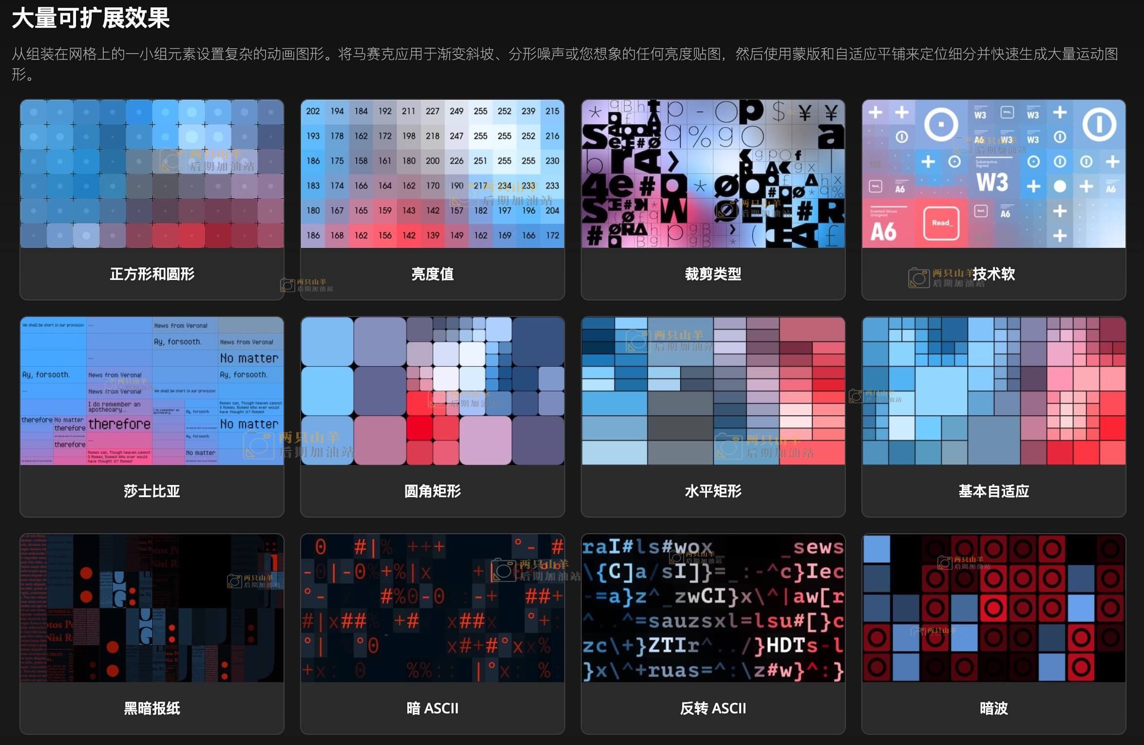 这是一套可轻松为形状、图形甚至ASCII字符集填充马赛克、碎片、图案效果的工具,产生具有非凡视觉效果,包含大量可扩展效果,而且还可充分修改定义图案,非常不错