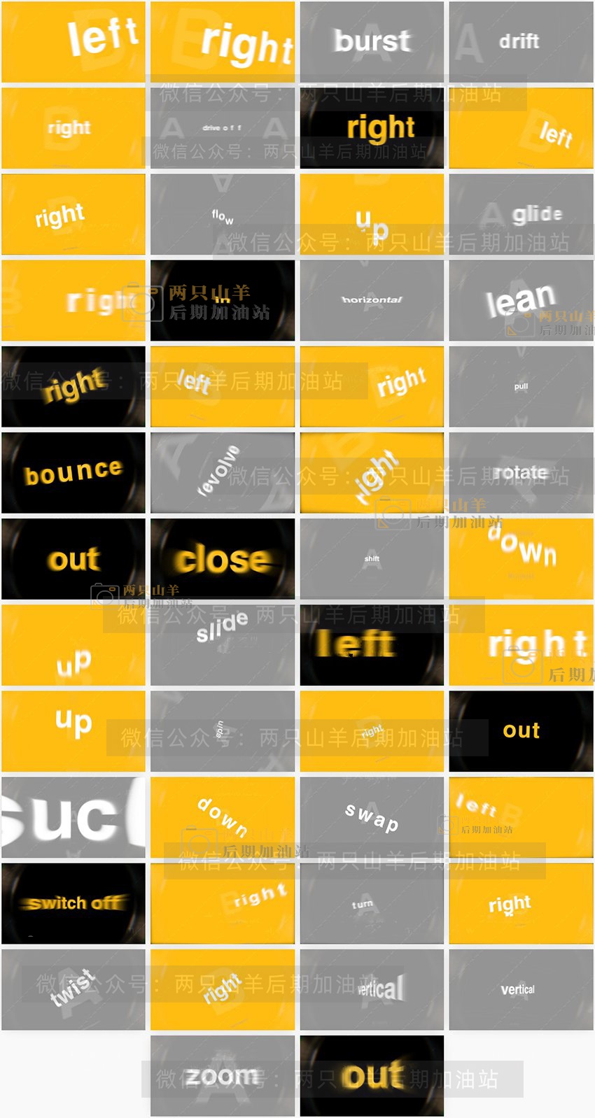 50组动感十足的、充满活力的标题过渡转场,简单易用,多参数可更改,多样式可选择,多种预设如旋转、缩放、位移等动感效果叠加。每个转场中间均有文字标题,可任意修改成其他中文/英文,也可以删除文字只要转场。非常适合快闪动感剪辑。