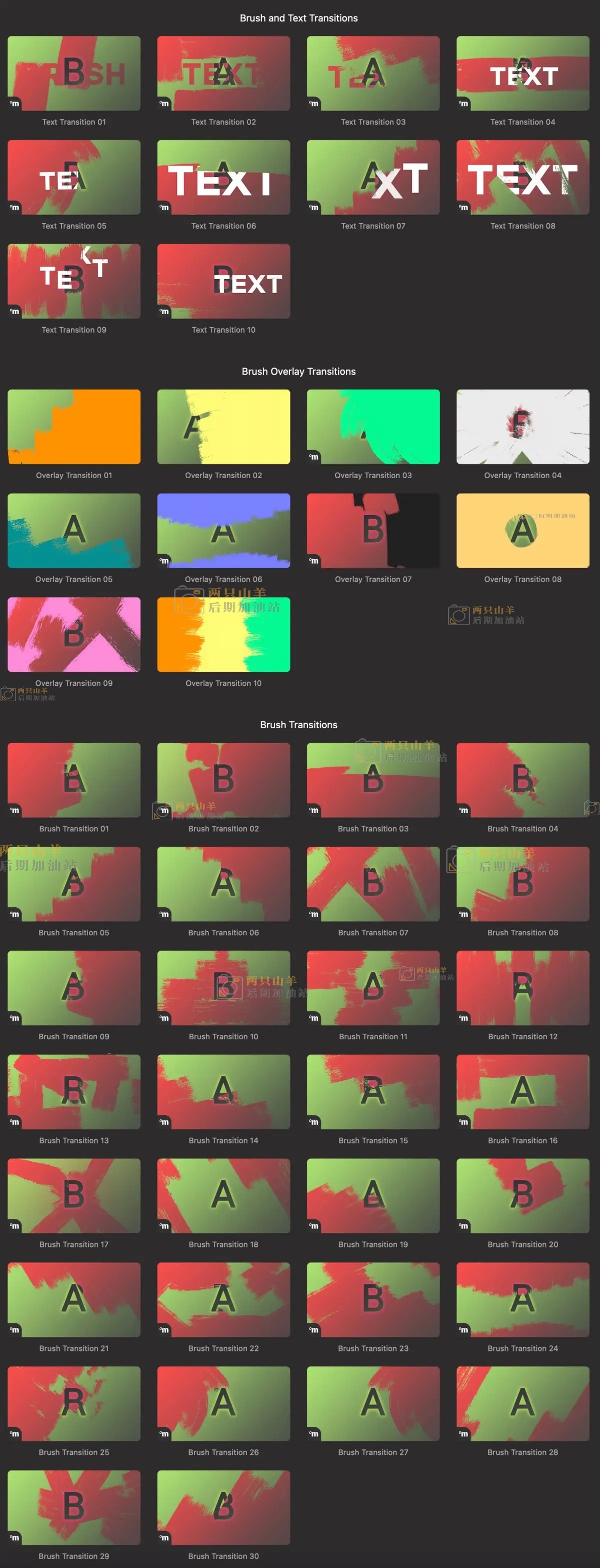 这是一套全新发布的多种用途FCPX插件,一共包含了50组炫酷、优雅的水墨笔刷过渡转场,简单易用。包含可插入标题式、前景叠加式、遮罩式,多参数可调节