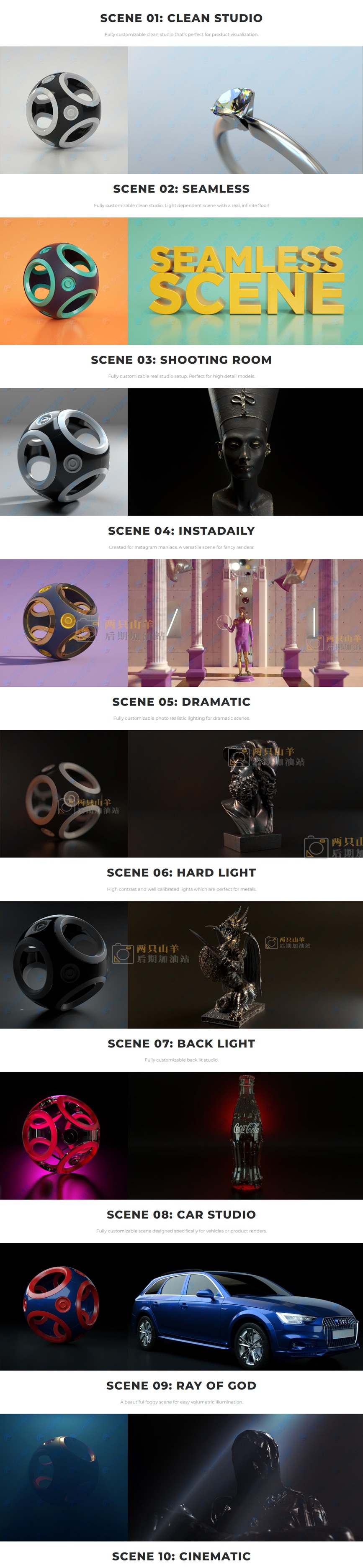 包含20种常用场景类型,例如室内摄影棚、无限背景、珠宝展示、数码科技产品展示、聚光灯、汽车拍摄、个性化场景、大气场景、背光、体积雾、长投影等。所有场景的灯光参数都已经绑定好Xpresso,颜色、强度、位置、角度等参数可以方便地进行修改。这个预设仅包含场景灯光环境,不包括宣传图中的场景模型。