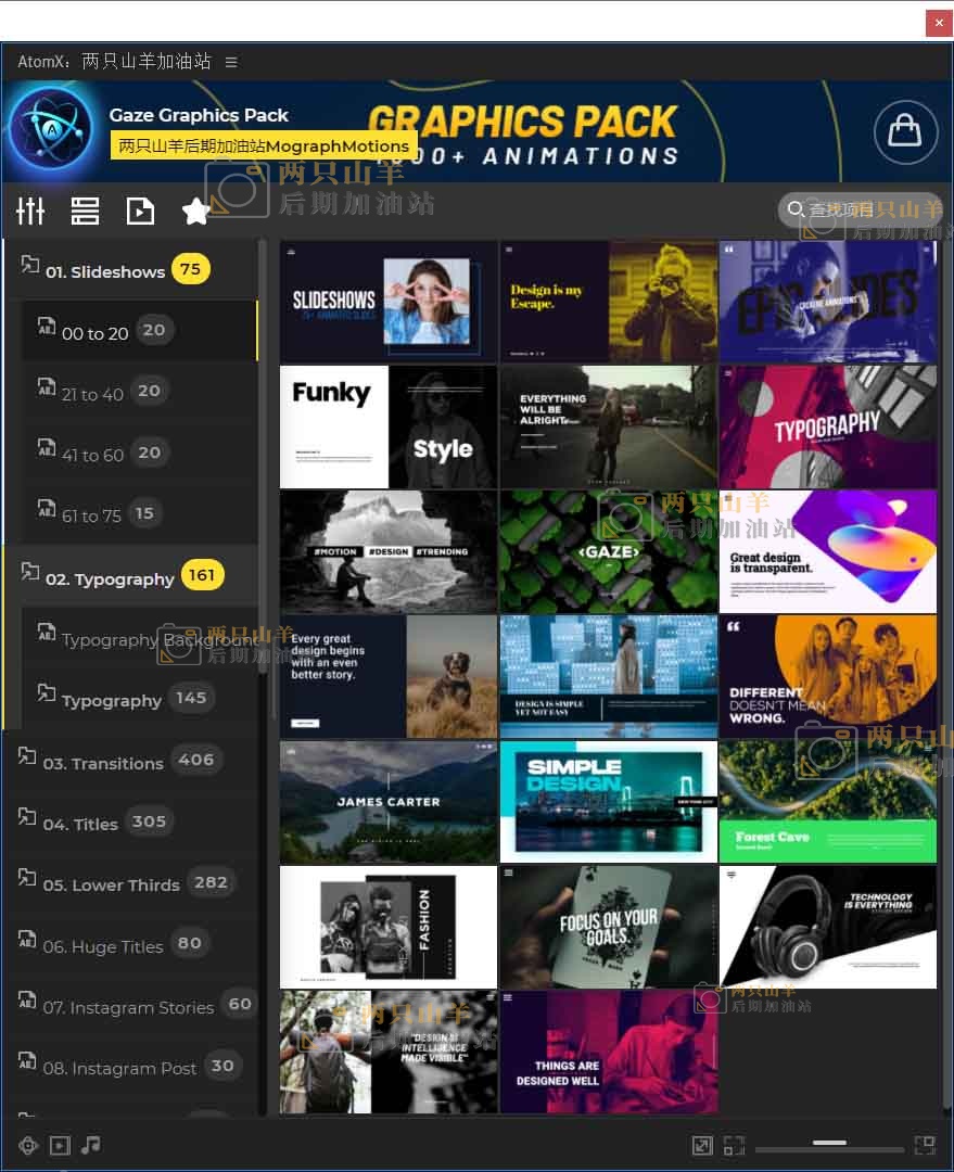 Gaze图形库是唯一包含4500多个即用型元素和预设的设置和效果工具包,只需单击几下即可将您的内容变成杰作。为了获得更直观、更快速的体验,此图形库还附带了AtomX扩展,通过AtomX脚本调用预设,可视化预览,直接使用于时间线。该扩展程序使用起来非常简单,并且由于该工具包包含大量元素和预设,因此AtomX扩展程序使为正确的工作找到正确的资产变得非常简单。