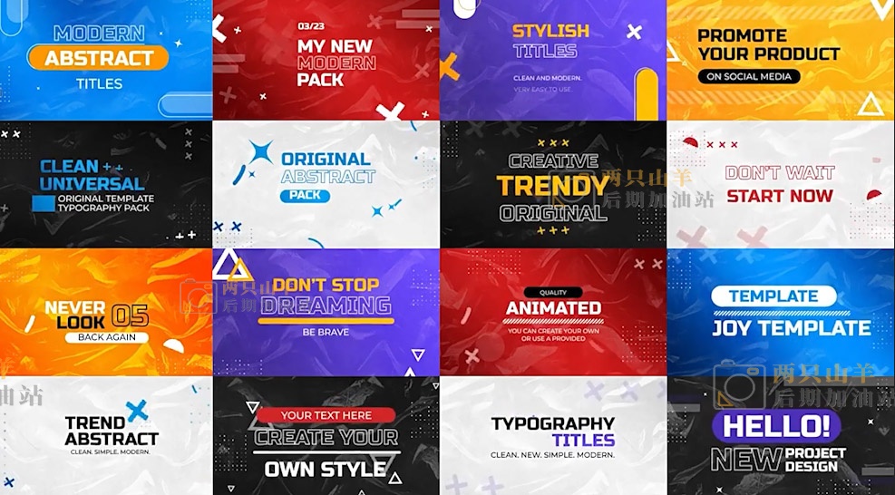 含了16组现代风格的文字标题排版动画附带背景,可作为分镜使用,支持中英文输入