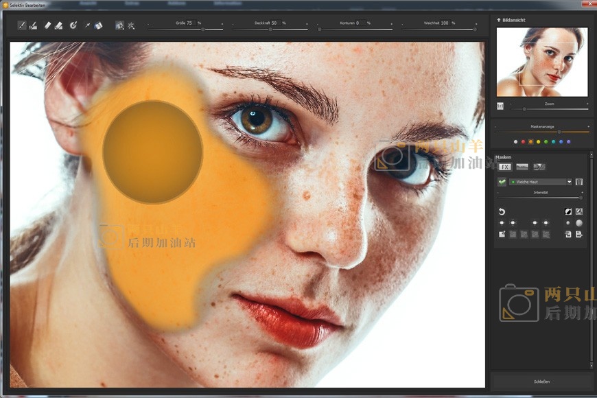 选择性绘图模块允许您单独编辑图像的特定区域,使用智能画笔功能自动查找轮廓,从而自动防止过度绘制 – 一种非常快速有效的选择性图像修改方法。这样,您可以轻松地为您的图像画龙点睛,让您的模特轻松获得纯净柔软的肌肤。你会很兴奋!