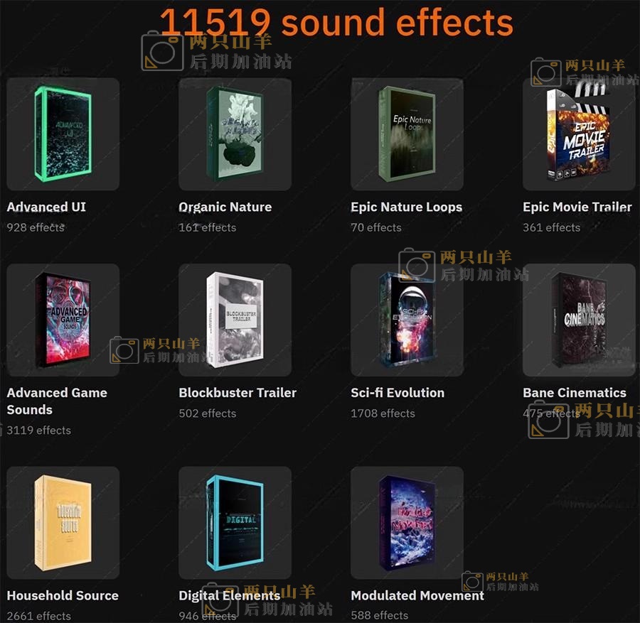 涵盖了从有机自然声音、UI用户界面sfx、科幻数字元素、电影效果甚至家庭源声音等各种声音!甚至从备受推崇的史诗电影预告片包中加入了额外的360度影院音效,为您提供迷人的音频/视频制作所需的额外优势!