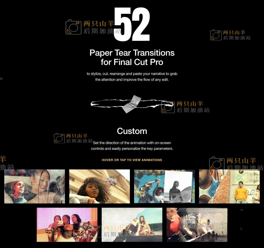 包含Final Cut Pro的52个撕纸过渡转场预设,采用拼贴元素,修复了出现红屏感叹号的问题,保证正常使用。可以自定义图片视频、颜色、大小位置等多种参数。