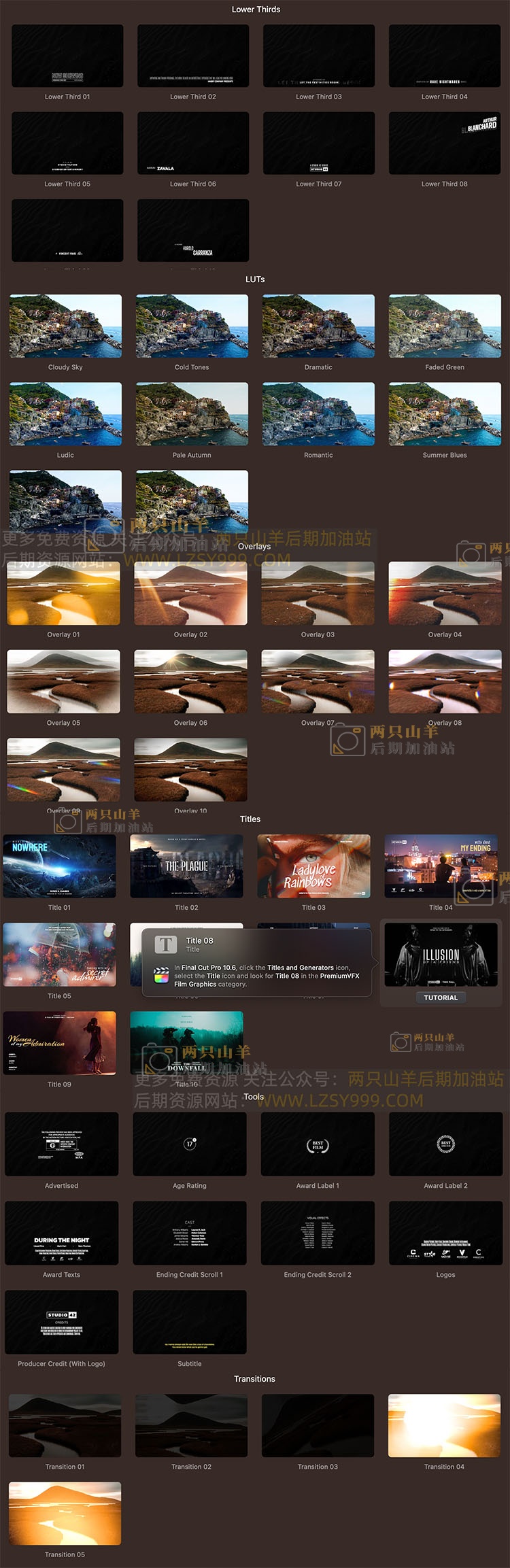FCPX插件-电影字幕标题调色转场光效叠加效果工具包 Film Graphics 1.0