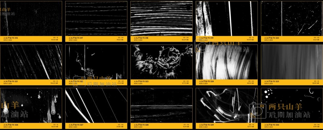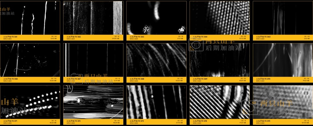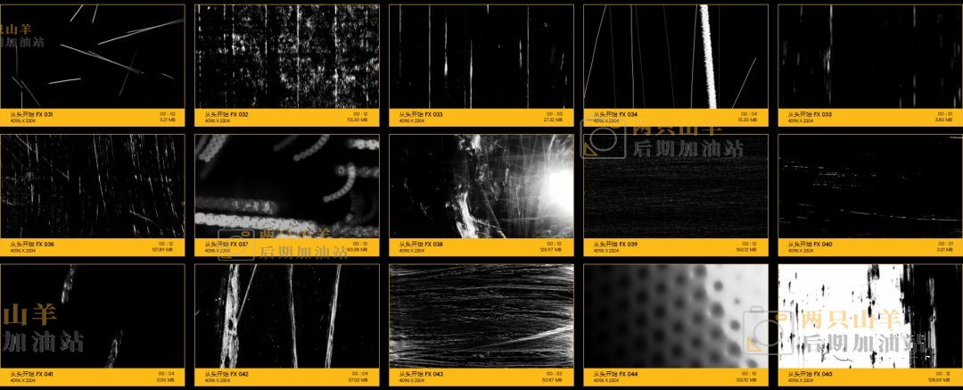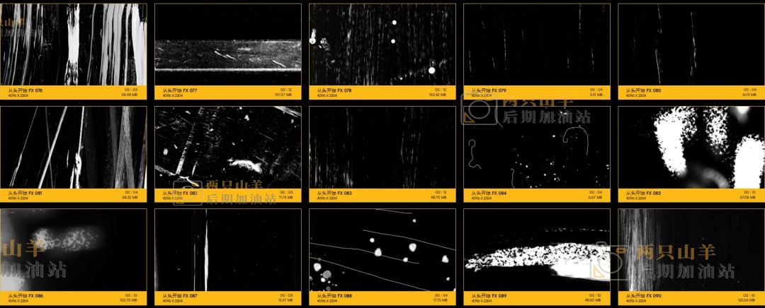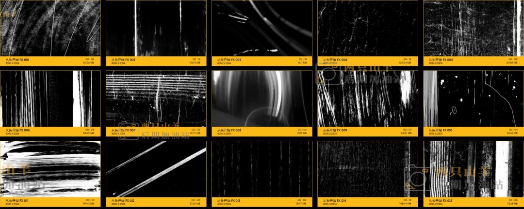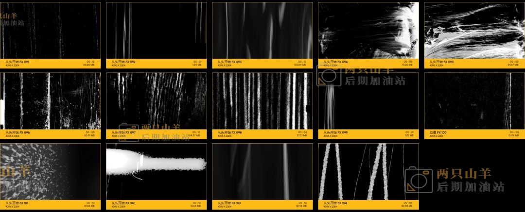104个划痕污渍刮伤损坏叠加特效合成动画4K视频素材。素材没有透明通道,可修改混合模式(滤色/屏幕)即可与你的视频素材叠加使用。