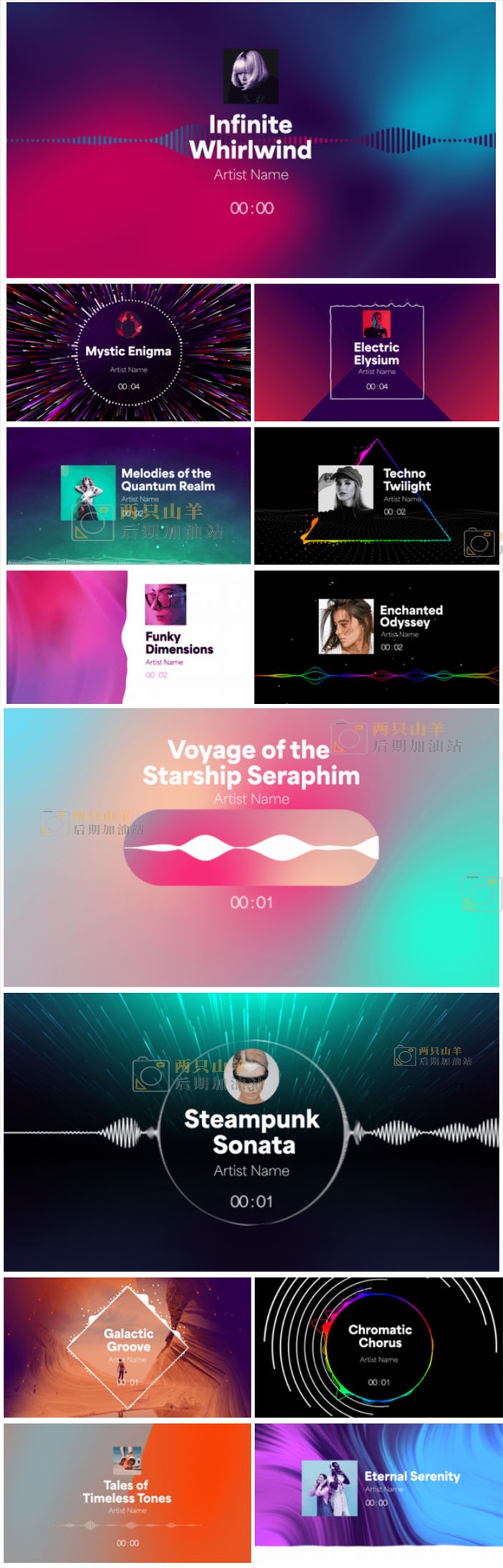 包含500个音频可视化效果,50个预设的音频可视化主题,300个背景。导入音乐,替换图片就可以自动生成,可以修改颜色等信息。