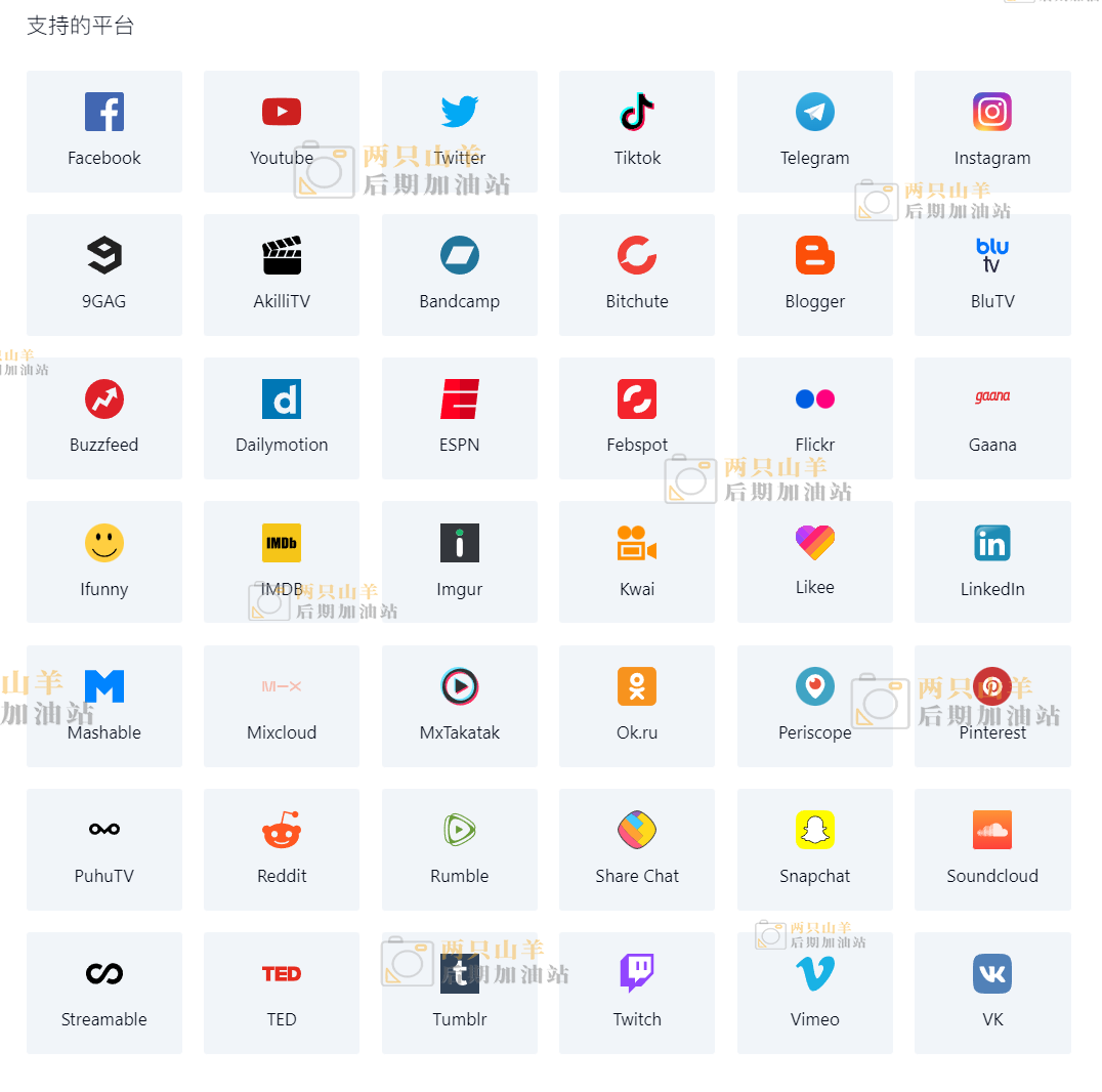 还包括国外的Facebook、Twitter、Instagram、Tiktok、LinkedIn、YouTube、Vimeo、Dailymotion等视频平台,甚至支持Imgur和Flickr等,Blogger和Tumblr等博客网站,以及更多。