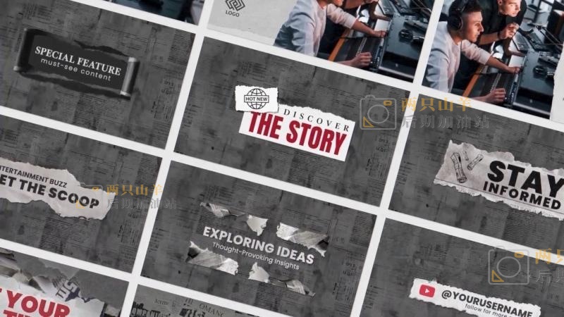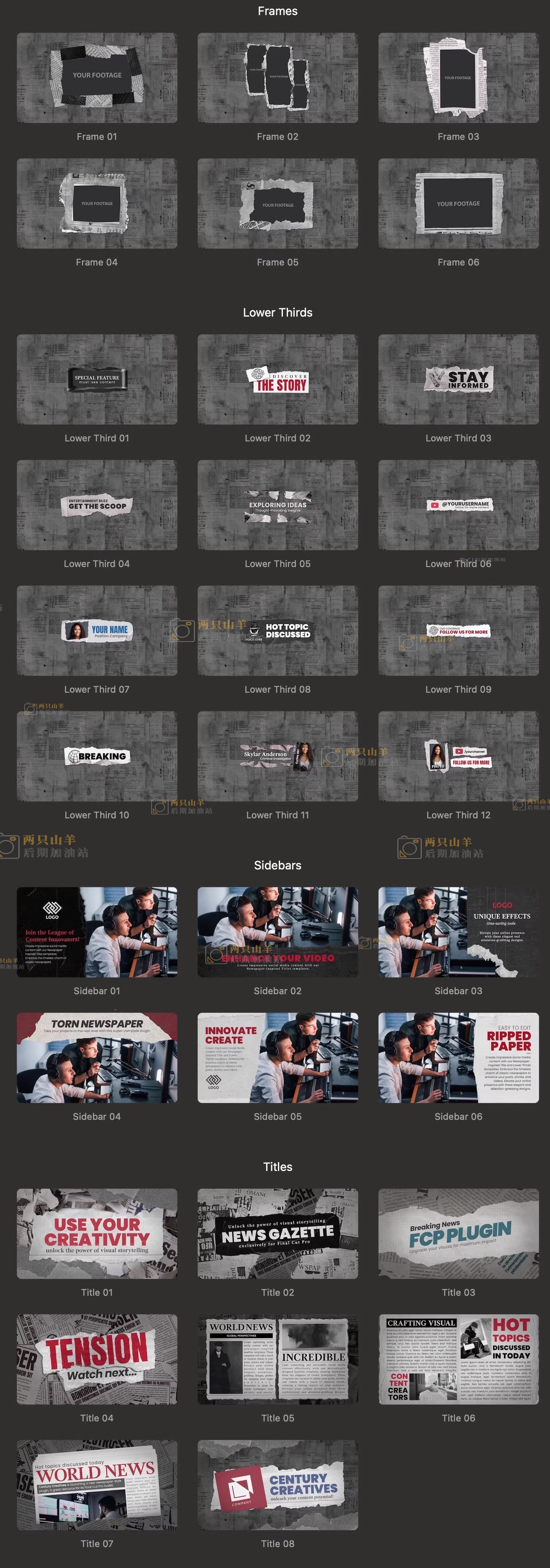 包含32种旧报纸侧边栏贴纸动画,如:文字标题、侧边栏、字幕条。可用于创建新闻快报效果,可以调整文本的位置、大小、方向等参数。