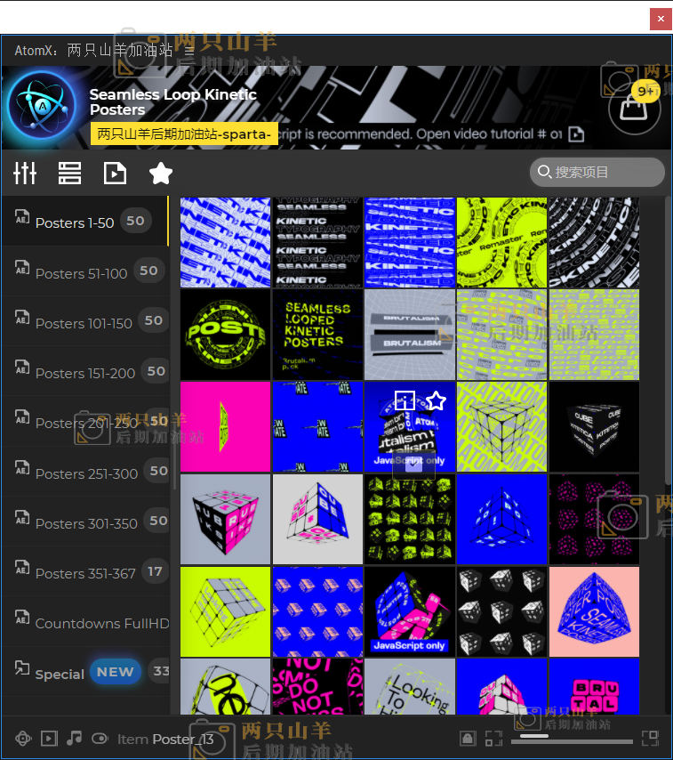 超过410个创意海报文字排版循环动画,兼容任何分辨率。通过AtomX脚本调用预设,可视化预览,直接使用于时间线,文字内容颜色字体均可修改。