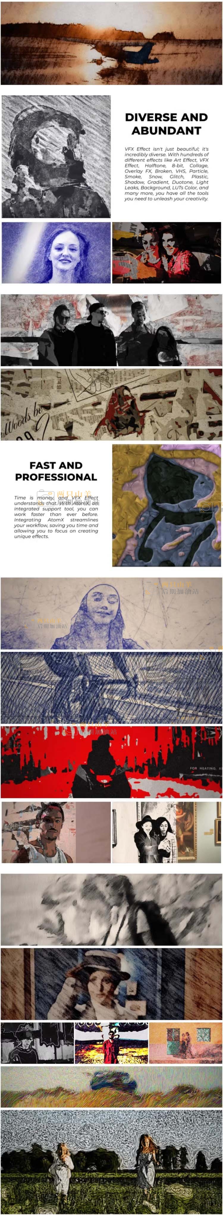 包含2000多种视觉特效预设,发布包含:240组视频特效(手绘、素描、铅笔画、粉笔画、卡通、老电影等)、163组渐变颜色叠加特效、629组视频叠加特效(玻璃破碎、投影、信号损坏、塑料、光效、污迹划痕、下雨下雪、烟雾、VHS、笔刷等)、846组视频调色预设、134组个性化单色预设、21组背景动画。通过AtomX扩展脚本可视化调用,双击即可直接使用于时间线,使用非常简单。