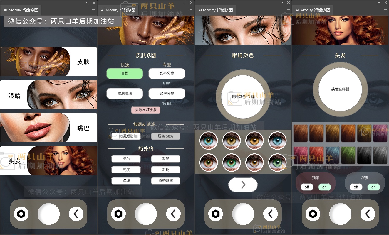 “修改”中的修饰部分专为初学者和专家而设计,有4个部分:皮肤、眼睛、嘴巴和头发,它具有频率分离等专家功能,对于初学者来说,它具有神奇的皮肤,只需点击几下即可获得惊人的效果。