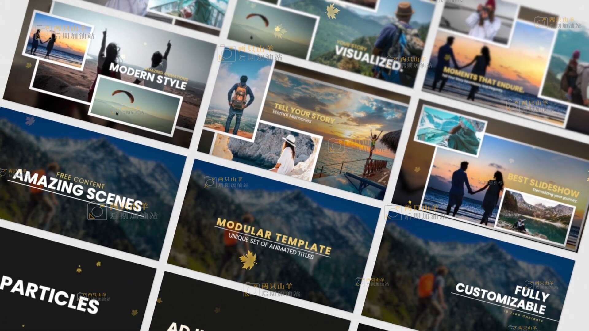 可用于创建视觉效果丰富的幻灯片视频。包含了许多预设的模块化幻灯片场景、开场白、标题和特殊效果工具。可以调整文本动画、颗粒效果(如下落的树叶)和其他图形元素。