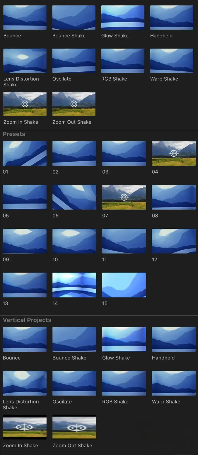 这是一套由Ryan Nangle出品的FCPX抖动转场预设,包含35种镜头摇晃冲刺震动效果过渡转场预设,也适用于竖屏视频的转场。