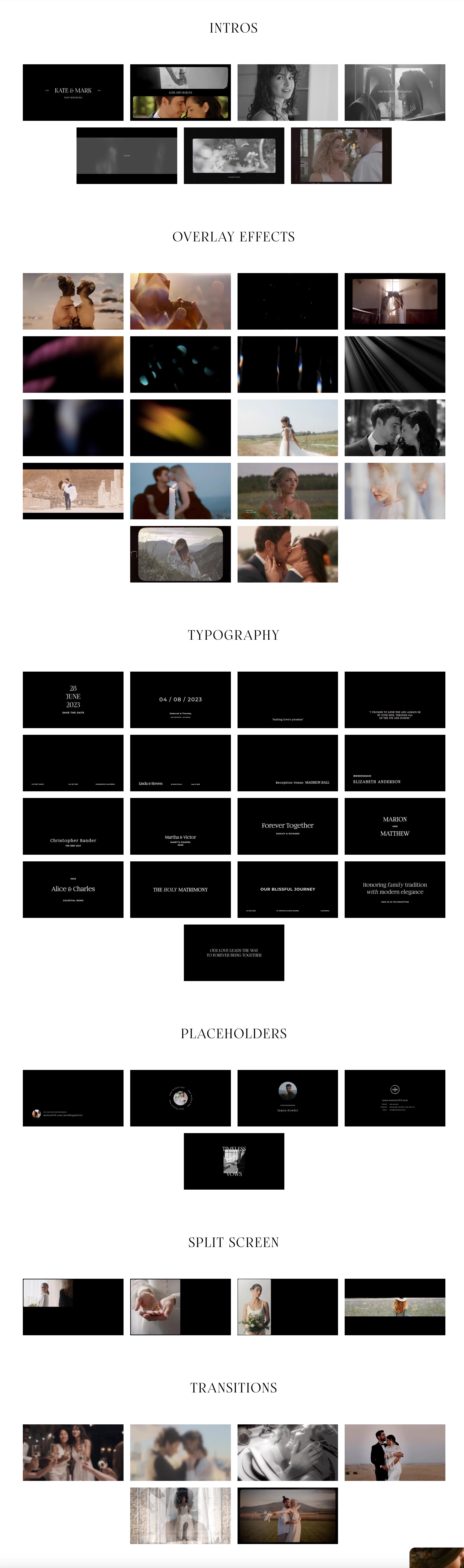 mWedding 2是一个专为婚礼视频制作而设计的工具包,提供56种精致和优雅的视频效果,包括过渡效果、标题、叠加效果、分屏和占位符、并附带5组调色LUT,等