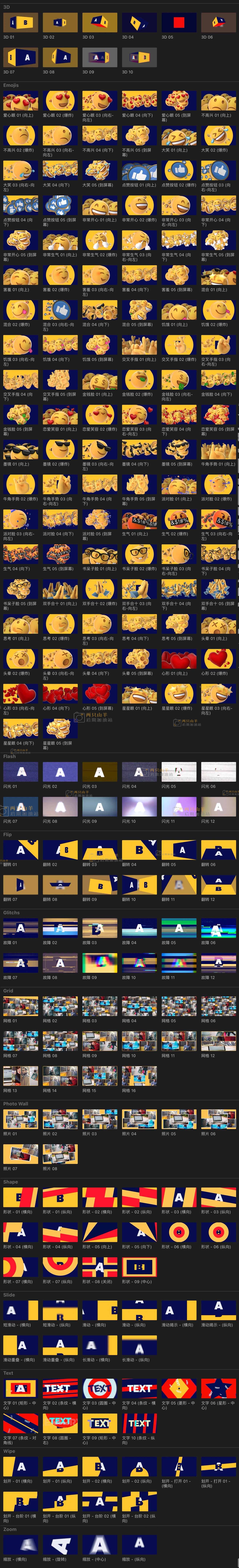 FCPX中英插件-230个创意图形表情3D翻转移动缩放故障闪光转场预设合集包 Emojis干扰图形翻页闪光图墙分屏标题等Big Box of Transitions