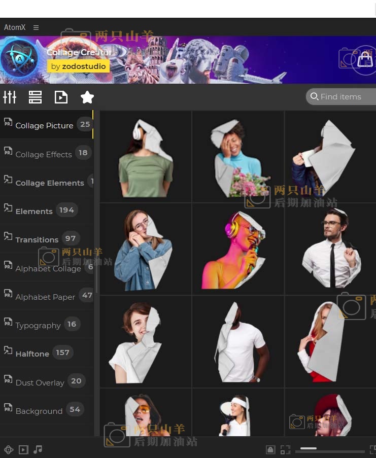 PR脚本-2400个创意人物动物植物花朵食物交通物品复古贴纸嘴鼻眼睛手脚头发日常物品定格动画预设 Collage Creator(AtomX 3.0.9)
