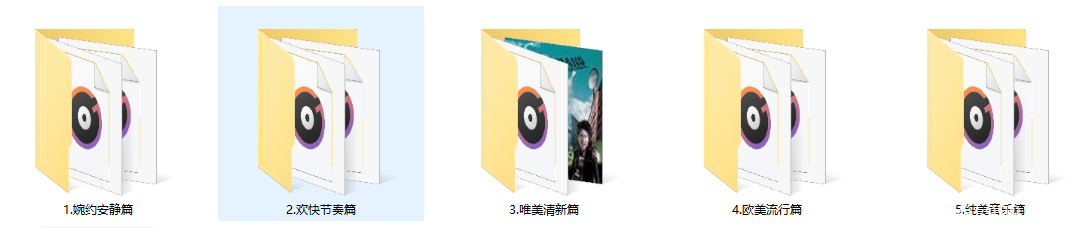 这5组类别分别为婉约安静篇、欢快节奏篇、唯美清新篇、欧美流行篇、纯美音乐篇。