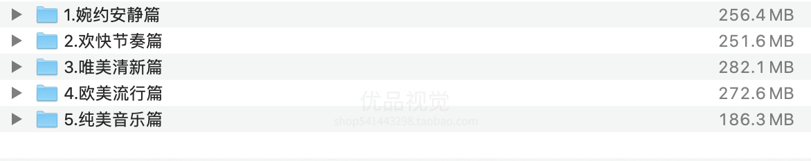 此套为340首婚礼后期剪辑音乐包,包含5组风格,曲风丰富,可以很好的解决婚礼后期找不到音乐的问题。