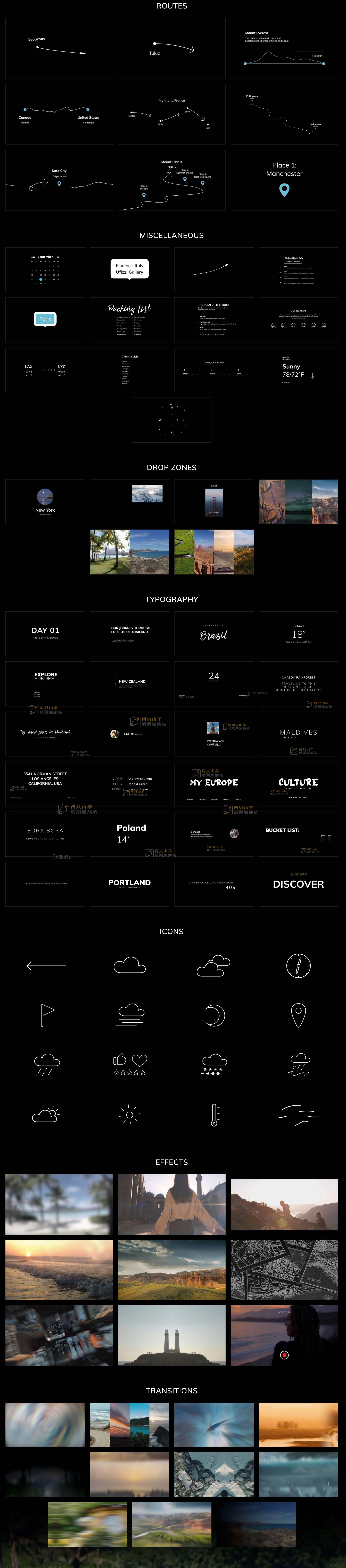 包含77组文字标题、图标、路径箭头、占位符动画、视频特效和11组视频转场预设,涵盖:路线指引动画、ICON图标、标题、图文模板、转场及效果工具等。可以设置是否需要出入动画、文字、字体、颜色、大小、位置、旋转等基本参数都可以修改。提供了中英文双语可选安装版本。