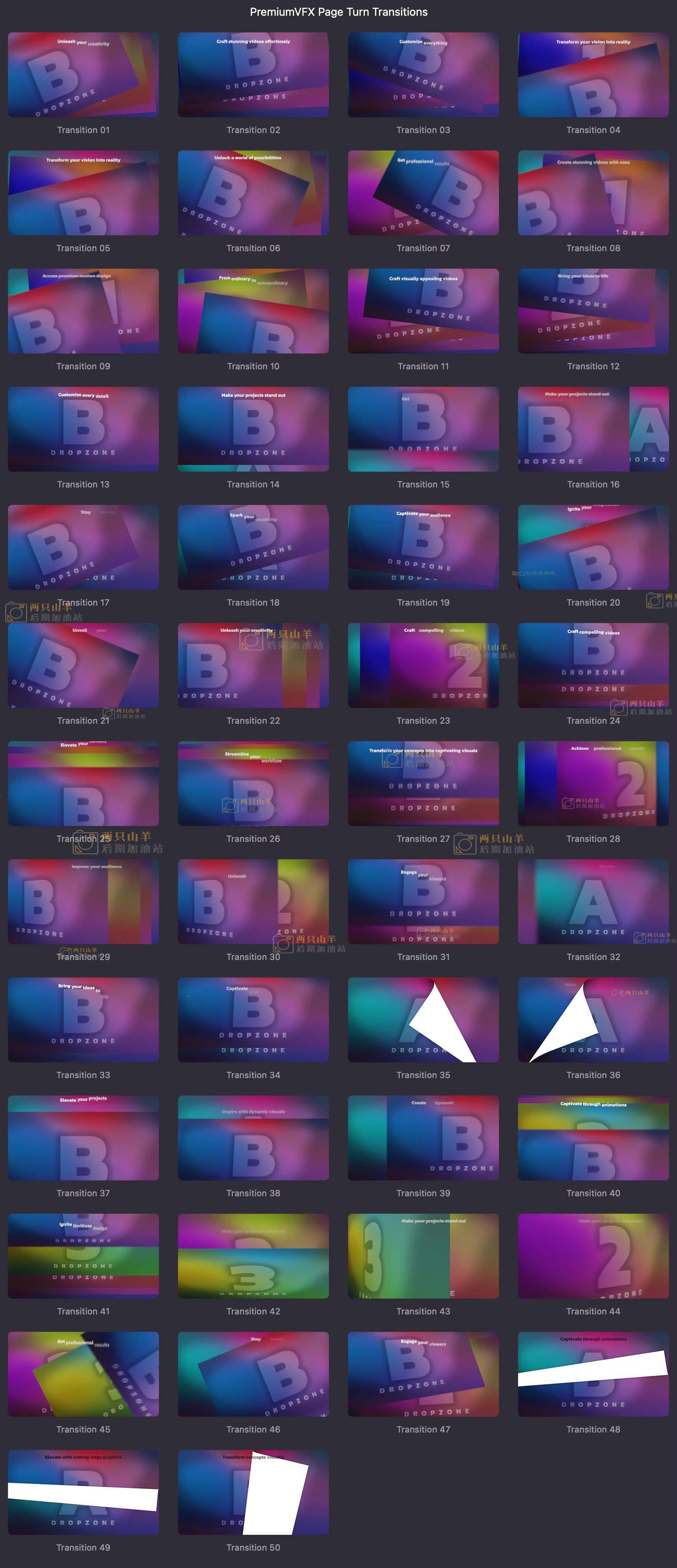 Page Turn Transitions for Final Cut Pro插件包含了50种不同的页面翻转过渡效果,适用于视频编辑中的场景切换和标题动画。可以在过渡中加入文本、媒体、特效(如模糊、发光、阴影等),以及调整过渡的长度、方向等参数。