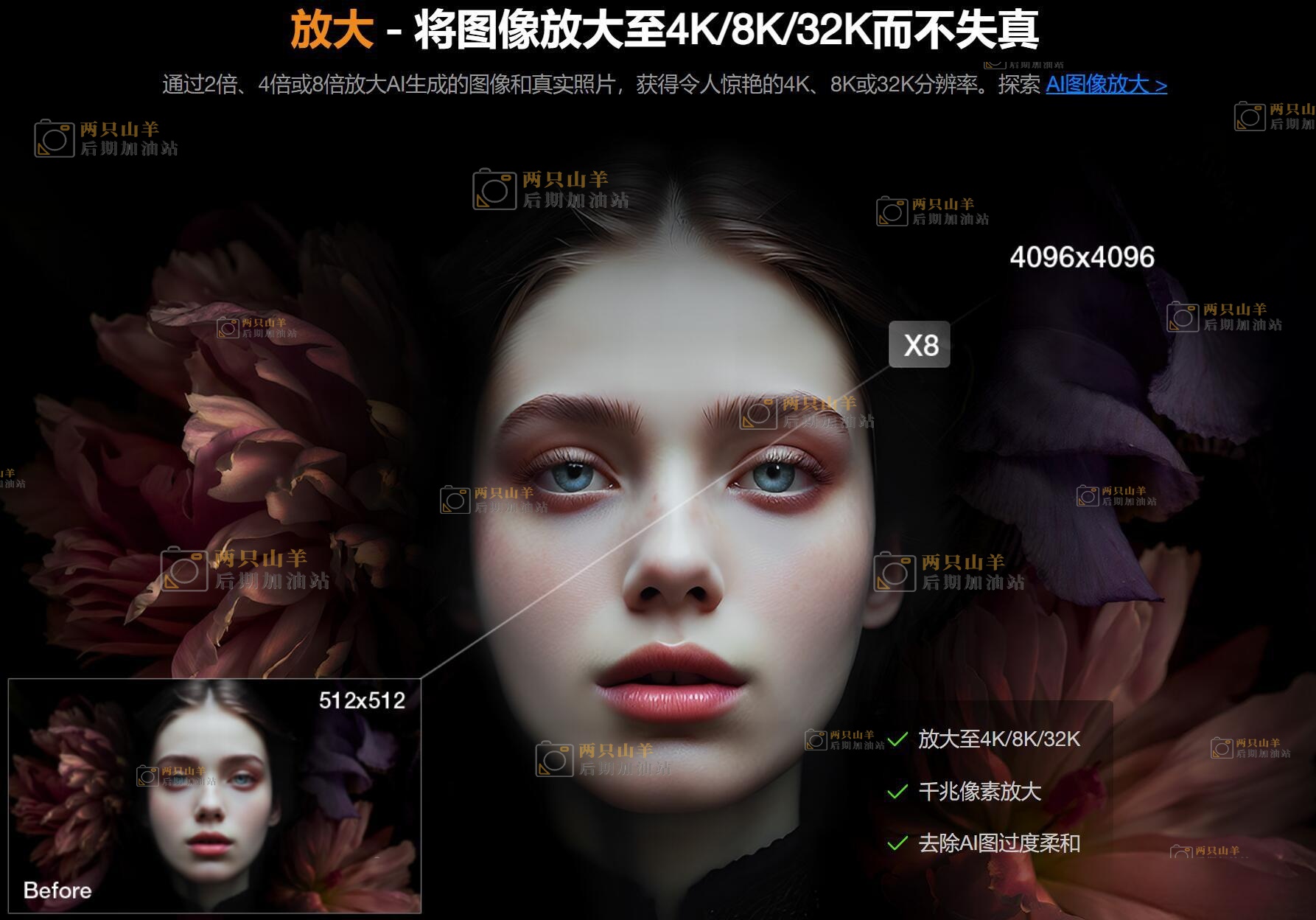 创新的AI模型:放大AI生成的图像,恢复有缺陷的照片,改善低质量的JPEG照片,确保出色的清晰度和细节。