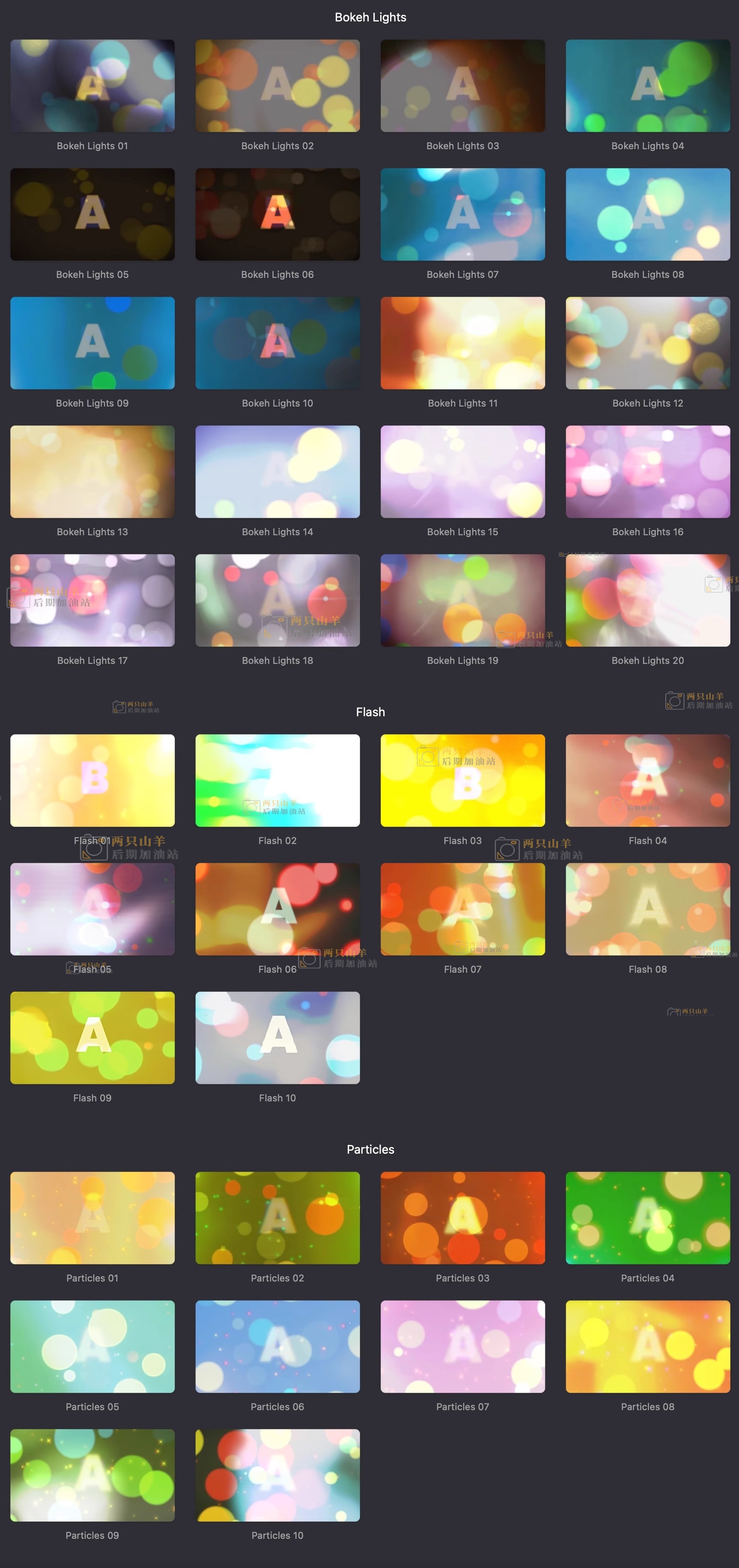 提供了40种精美的精美优雅光斑散景闪光炫光效果过渡转场预设,分三个类别:光斑、闪光、粒子。适合用于制作柔和的光晕、震撼的闪光、或者充满动感的粒子效果,给视频添加层次感和独特的视觉吸引力。