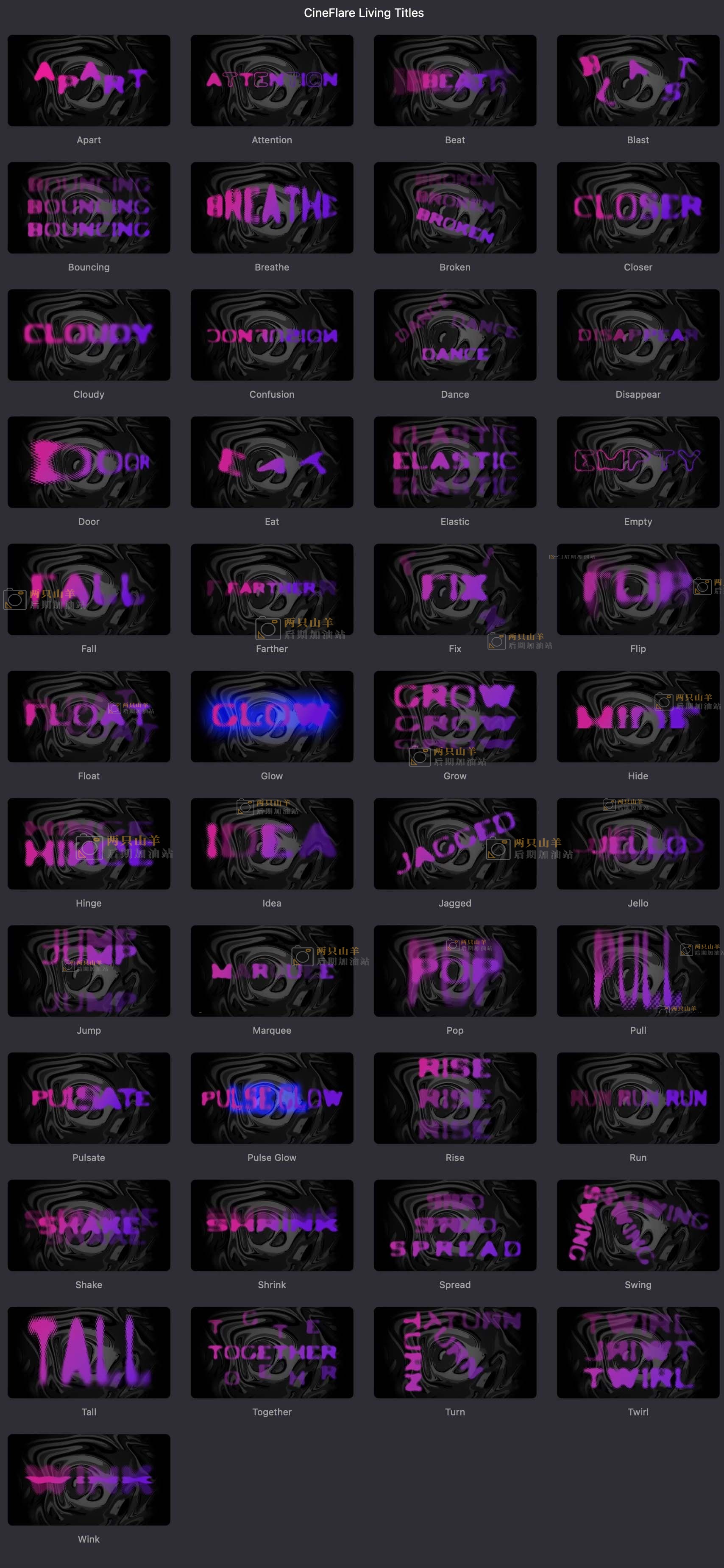 Living Titles插件提供了45种预先动画化的动态标题,将标题中描述动作的单词与相应的动画相匹配。这些标题通过具有表现力的动画形式,帮助突出视频中的关键文字,传递更加丰富的情感与信息。