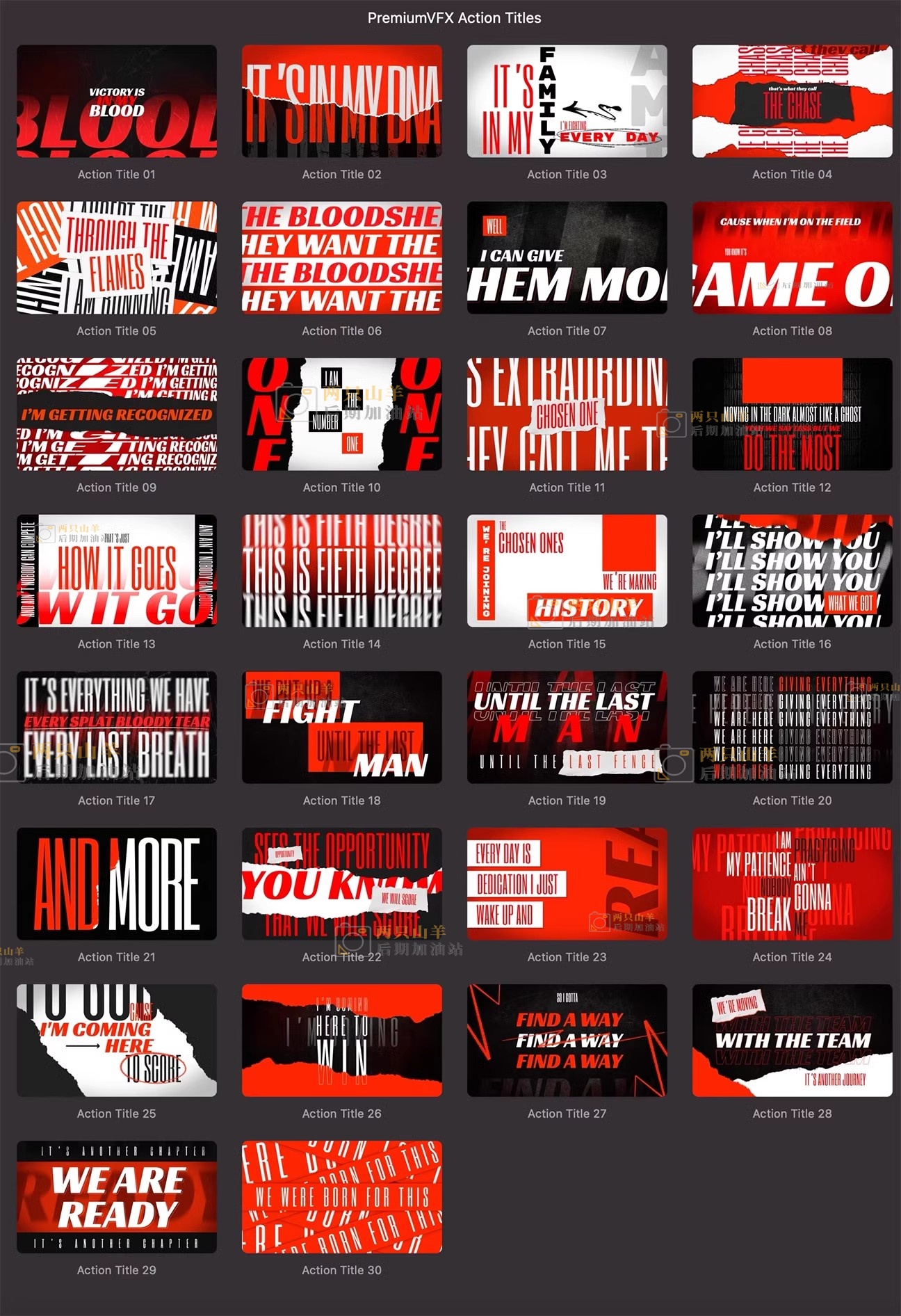 FCPX中文插件-30组震撼现代动感全屏文字标题排版动画 Action Titles