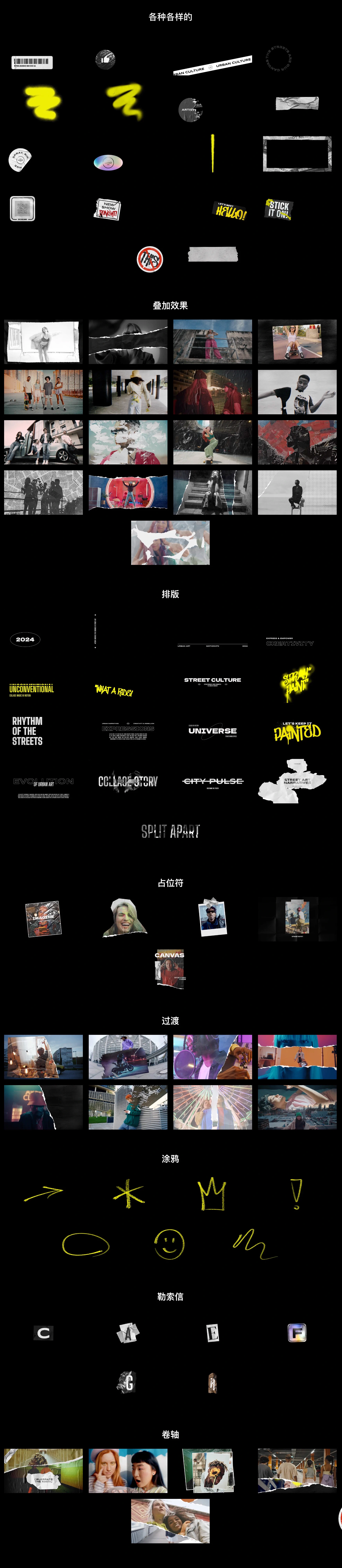 包含83组时尚潮流的纸张撕裂转场效果、涂鸦笔画和拼贴纹理元素。这些视觉效果可以让视频编辑更加有创意和动感,适用各种时尚风格的视频项目。包括:75个标题(Titles)、8个转场(Transitions)