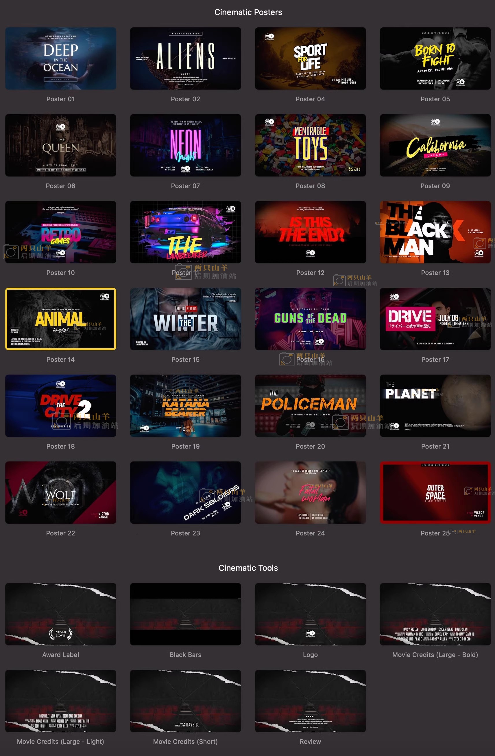 Cinematic Posters是一款Final Cut Pro插件,用于创建具有专业水准、电影风格的标题画面和动态元素。电影预告片视频项目增添好莱坞般的质感,包含24个海报封面图文排版设计动画和7个简易标题,如奖项标签、电影字幕和黑边效果。