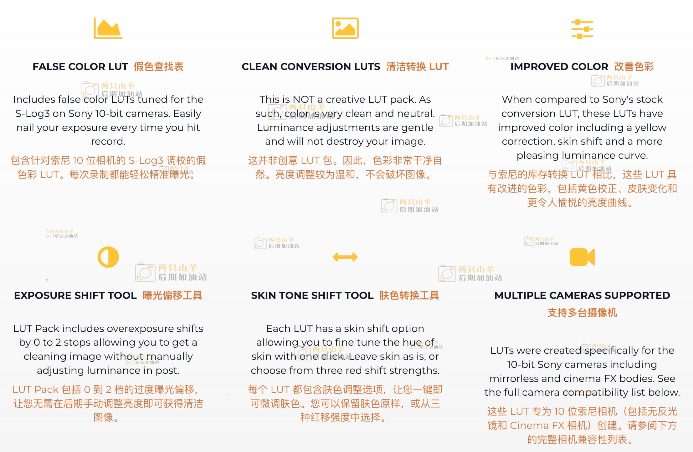 索尼相机转换LUT 这是一套对索尼相机用户非常友好的转换lut,可以轻松转换并进行分级调色和曝光补偿,改善肤色,包含假色lut,25个分级调色lut和快速分级LUT,索尼用户必备