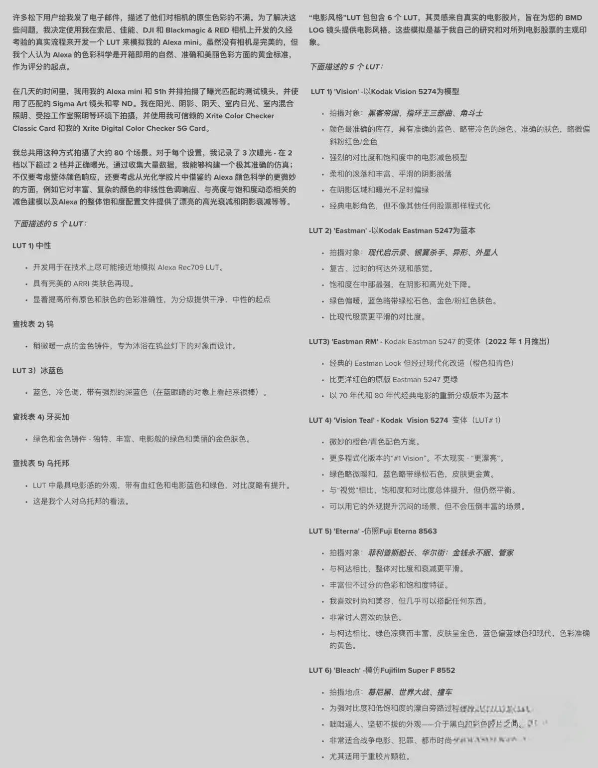 许多松下用户给我发了电子邮件,描述了他们对相机中出现的原生颜色的不满。为了解决这些问题,我决定开发一个LUT来模拟我的Alexa mini,使用我在索尼,佳能,DJI和Blackmagic&RED相机上开发的久经考验的工艺。虽然没有相机是完美的,但我个人认为Alexa的色彩科学是开箱即用的自然,准确和美丽的色彩的黄金标准,作为评分的起点。