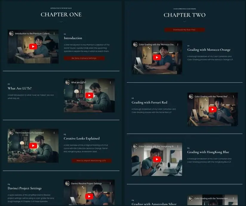 包含4个原始LUT,2个数字镜头效果,4个监控LUT,我的索尼相机设置,iPhone LUT和21个独家颜色分级剧集(DVR,精心设计,为您的镜头增添额外的“电影酱汁”