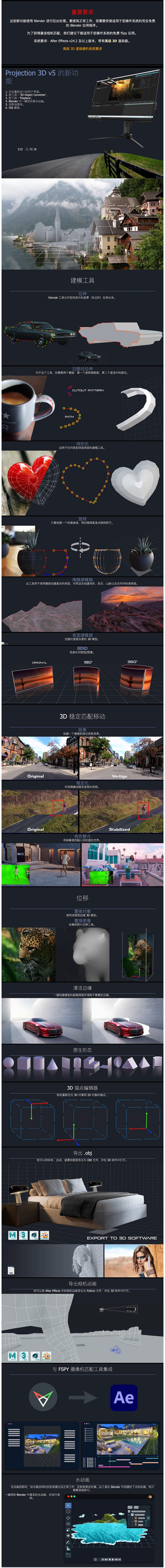 Projection 3D可以在AE中制作各种摄像机投射效果,将图片制作成三维动态效果,利用Mask遮罩抠出复杂的图像然后制作成三维空间效果,旋转弯曲图片等。新功能: 全新用户界面、3D 对象转换器和置换工具、一键式逼真水景、投影场景库和 OBJ 编辑。