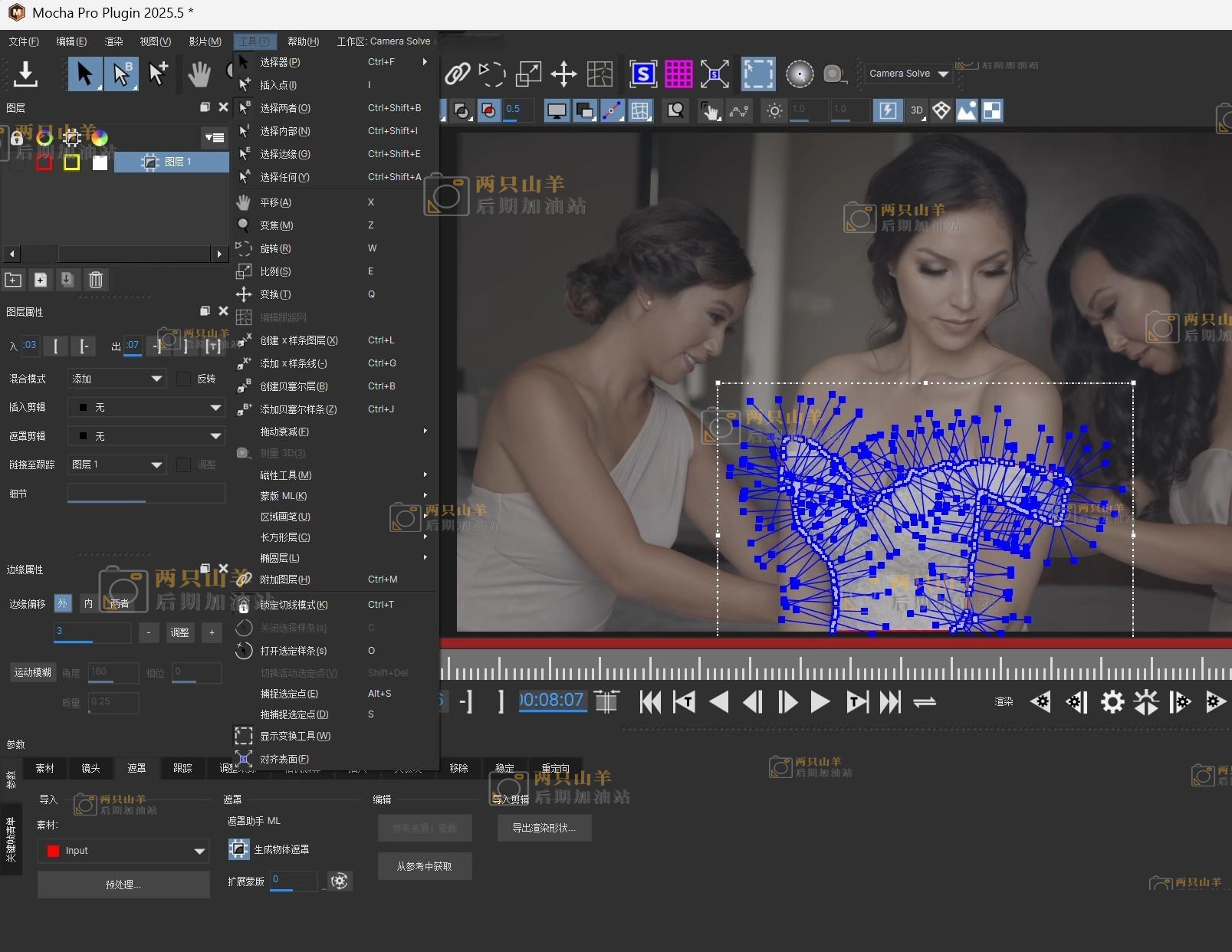 - Matte Assist (AI) 遮罩辅助 (AI):从单一输入自动生成动画矢量遮罩,然后将您的遮罩与 Mocha Pro 的跟踪、对象移除和 3D 相机解决模块一起使用。