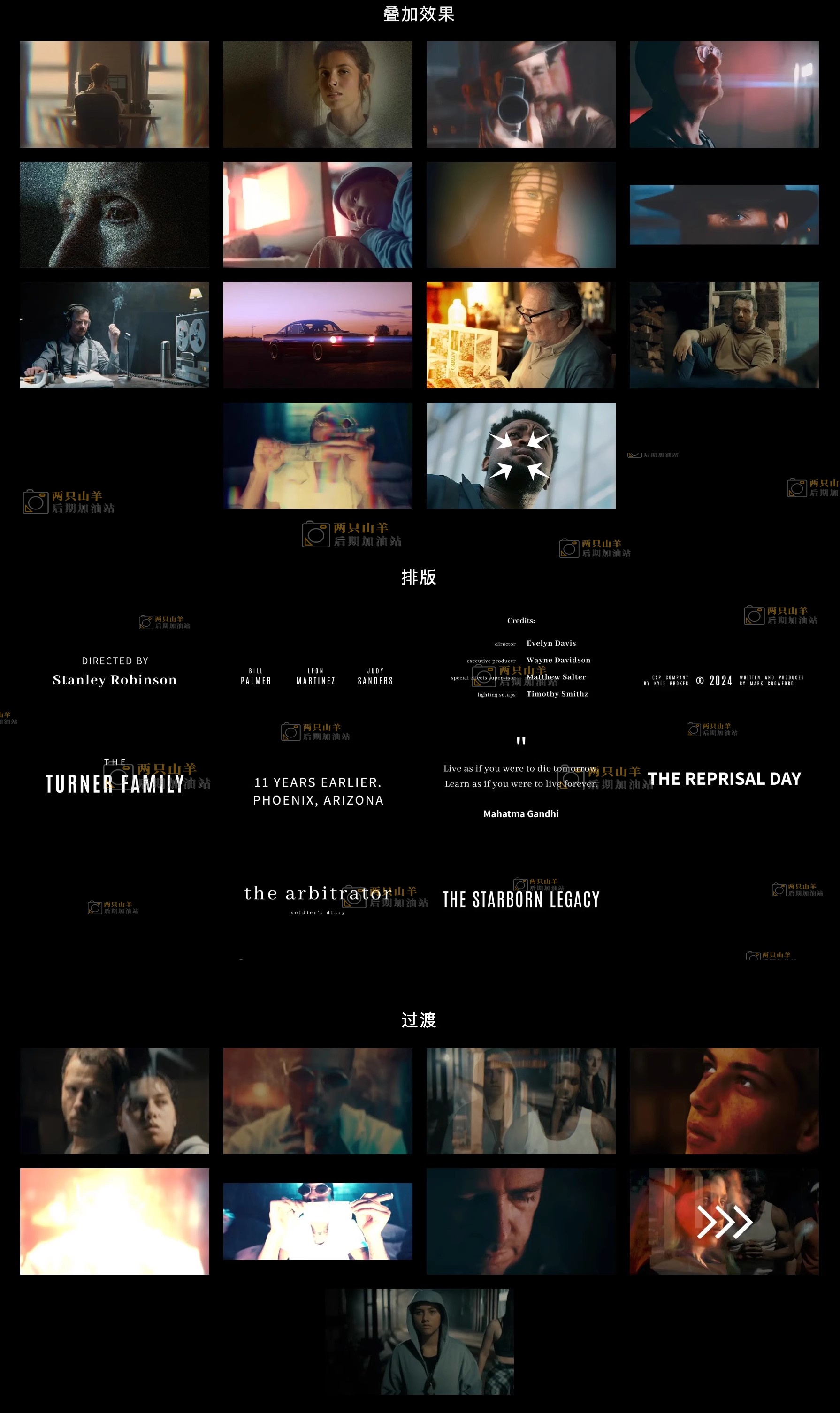 一套视频编辑插件包,专为制作电影风格的视频而设计。它包含多种叠加效果、过渡效果和标题,可以通过这些工具轻松创建专业的视觉效果。这些效果包括模糊、颗粒、光扩散、变形等,支持实时预览和多层叠加。安装完成后,可以在视频编辑软件中的过渡和标题部分找到这些工具。