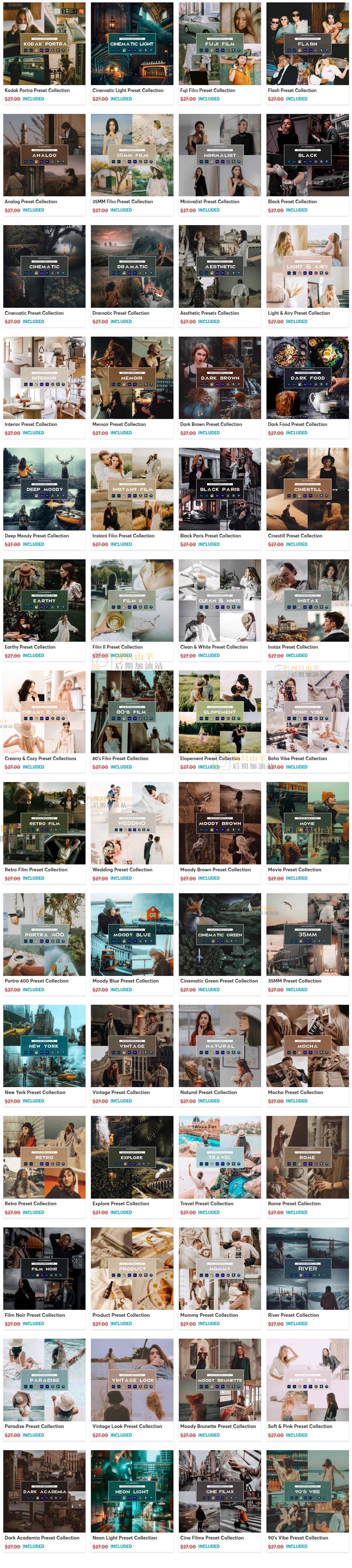 The Master Preset Bundle汇集了56套专业级预设合集,共包含721款Lightroom预设+LUTs视频调色预设,全面覆盖人像、风景、婚礼、复古胶片、电影风、极简风等多种风格。