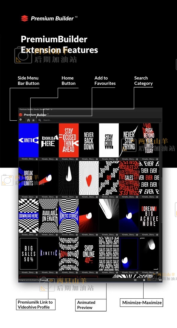 提供100组创意竖屏文字标题LOGO排版,适用于任何字体,无需插件。轻松定制文本,颜色控制等。使用PremiumBuilder脚本扩展,动画预设效果可视化脚本方式,点击即可加载使用,脚本支持AE和PR,还提供AE模板工程。