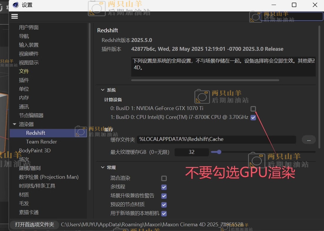 注意:redshift CPU模式渲染正常,GPU模式无法使用,需要在Redshift首选项里取消勾选你的显卡,只能用CPU渲染。