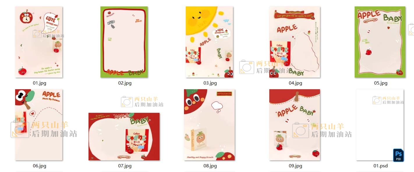PSD模板-9款卡通可爱苹果玩偶儿童宝宝周岁百天写真照设计psd模板后期ps素材