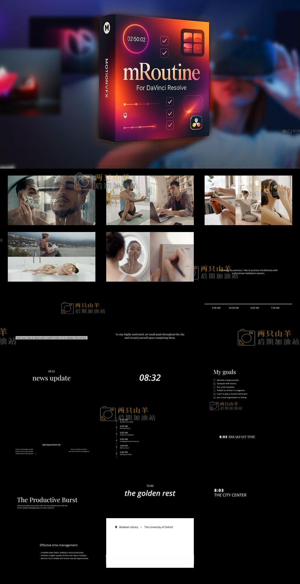 mRoutine专为制作新闻、直播、日程安排或高效生活类视频设计。内含14种专业标题(倒计时、新闻条、目标清单、地点、日程表、字幕等),风格简约、排版精致;3种流畅过渡效果,切换自然无抖动;以及3种分屏效果,轻松将画面分割成2-3部分。特别适合制作信息流、日常计划或高效风格内容,让视频呈现专业质感。