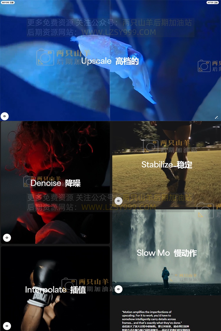 利用人工智能算法自动识别和分析视频中的元素,进行去噪、伪影和抖动修复,提升视频的清晰度、稳定性以及色彩、对比度和细节等,还具备 AI 驱动的抖动稳定功能,在许多情况下比行业领导者表现更好。