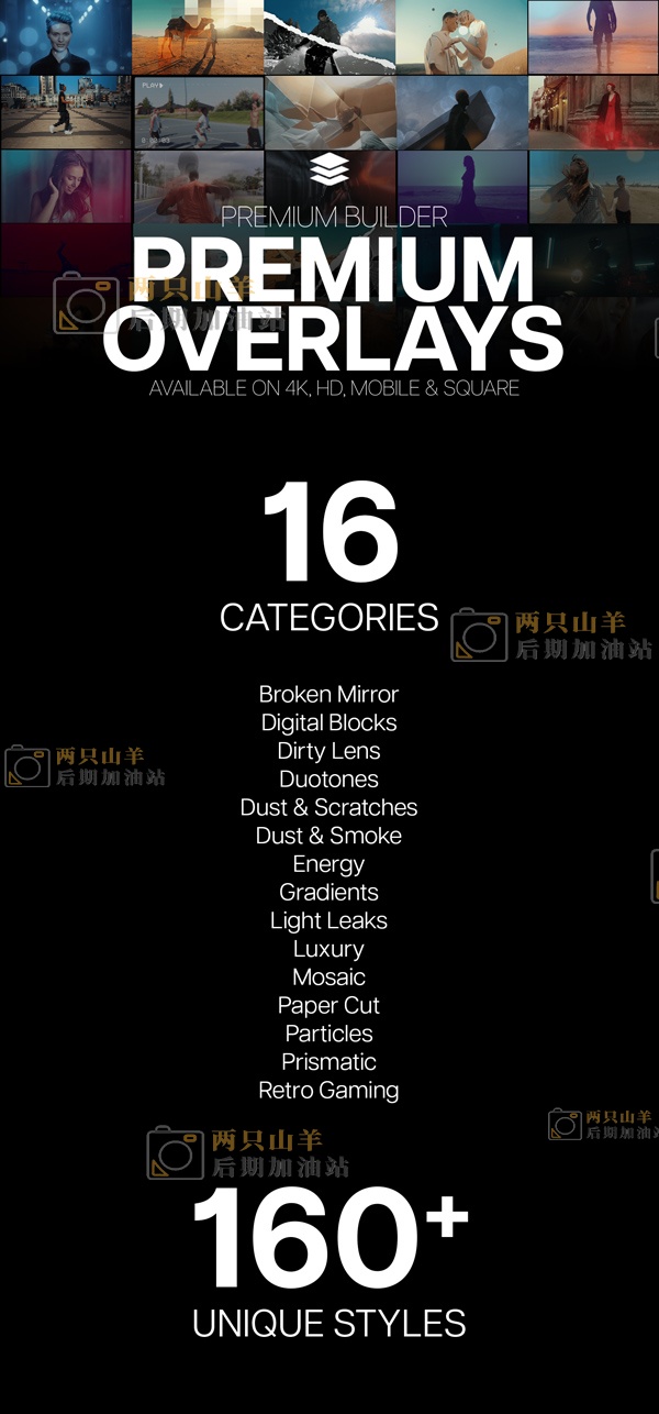 拥有16个高级覆盖类别,超过160多种独特风格预设,如光效、故障、污渍、马赛克,遮罩、VHS复古、烟雾、撕纸等。Premium Overlays 使用 PremiumBuilder 脚本扩展,动画预设效果可视化脚本方式,点击即可加载使用,脚本支持AE和PR,还提供AE模板工程。所有素材均支持4K、HD、移动端与方形分辨率,无需额外插件,内置扩展工具,可快速预览、搜索与收藏特效,搭配语音教学视频,让你轻松打造梦幻、电影感十足的视觉效果。无论是电影包装、广告、短片还是Vlog,这套合集都能为你的画面增添艺术气息与专业质感。