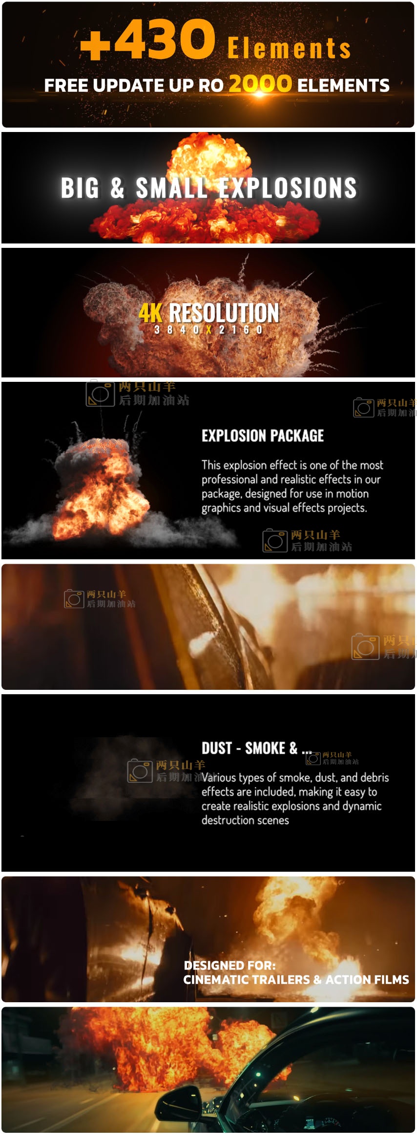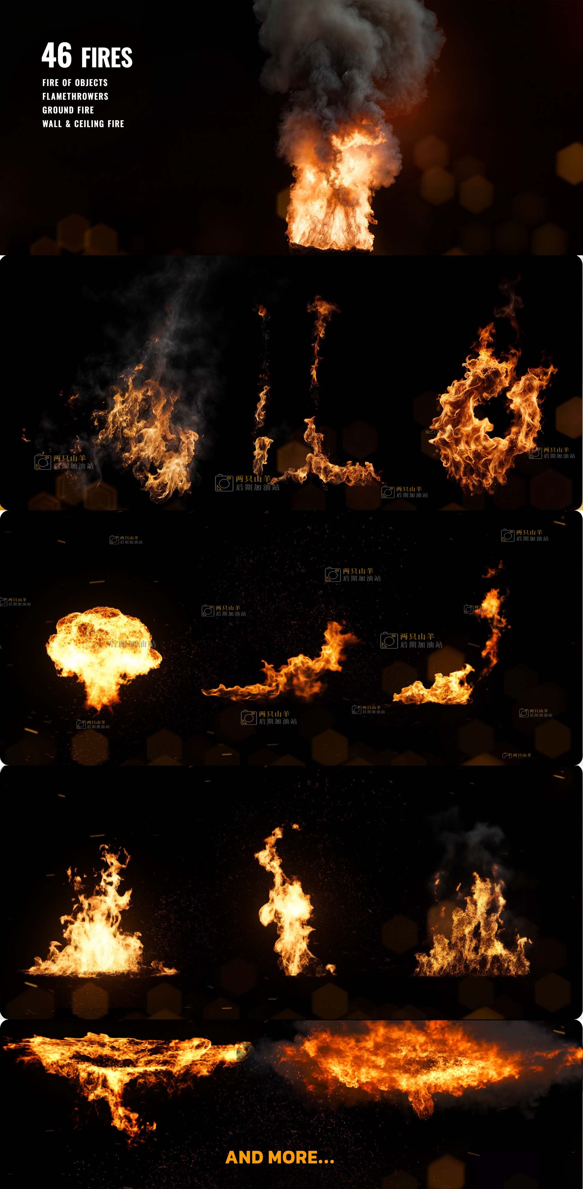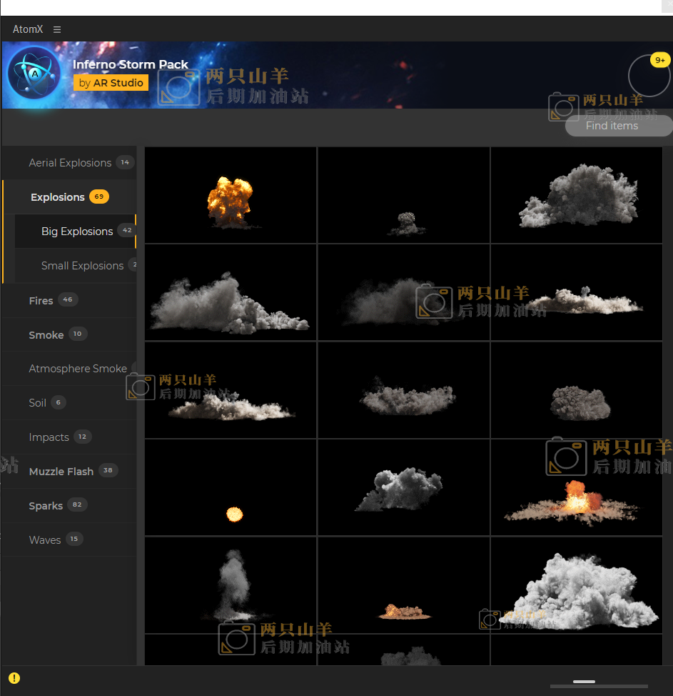 这套脚本设提供了296种火焰、燃烧、爆炸、烟雾、粉尘、火星粒子、枪口火焰、碎片、特效合成预设,使用 AtomX 脚本加载,可视化预览,点击即可加载使用。其中除枪口火焰和火星粒子没有通道,其他效果均带透明通道。当然没有通道的也可以使用混合模式透明叠加。